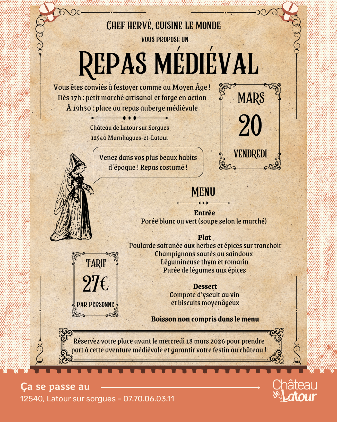 Le 20 mars, Chef ’Hervé, en collaboration avec le Château, vous propose une fin de journée et une soirée pour un véritable retour au XIVᵉ siècle. Au programme : un repas riche aux saveurs d’antan où les épices délicates et non piquantes, ainsi que le safran, occupent une place de choix. Les produits locaux et de saison seront mis à l’honneur afin […]