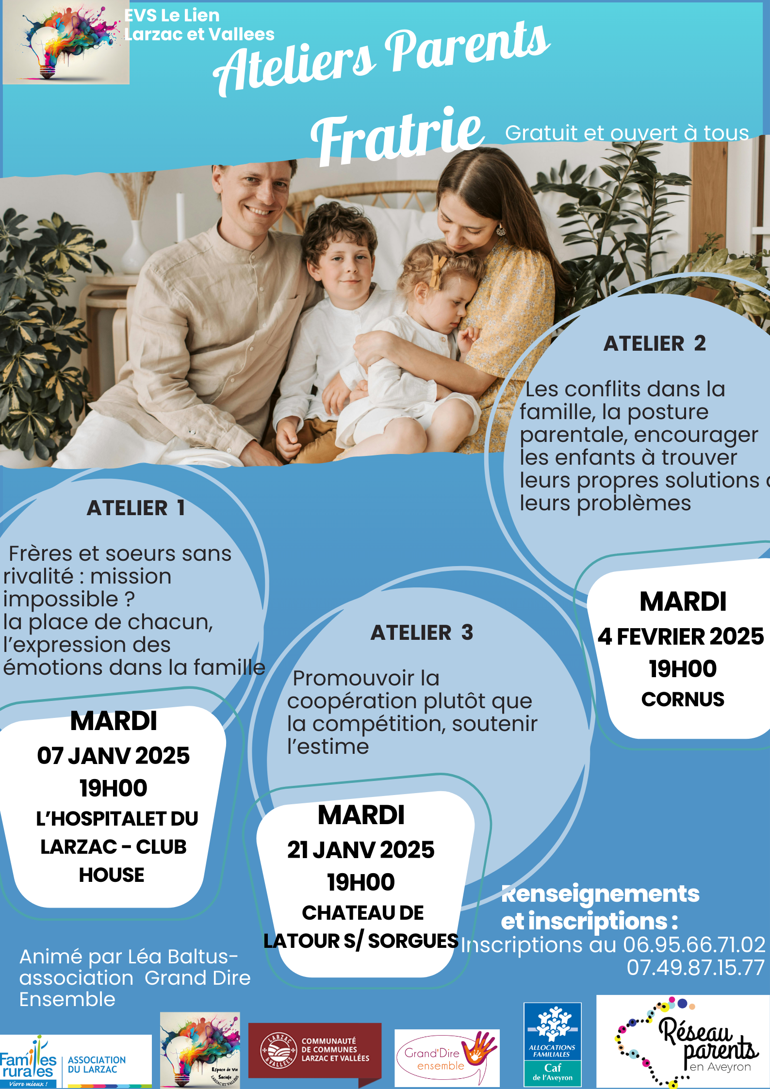L’Espace de Vie Sociale Le Lien intervenant sur l’ensemble du territoire de la Communauté des Communes Larzac Vallées propose une trilogie d’ateliers parentalité gratuite et itinérante sur la thématique de la fratrie. Ils seront animés par l’association Grand’Dire Ensemble. Chaque atelier abordera une thématique différente (la place de chacun, la non rivalité, la coopération, l’expression des émotions, […]